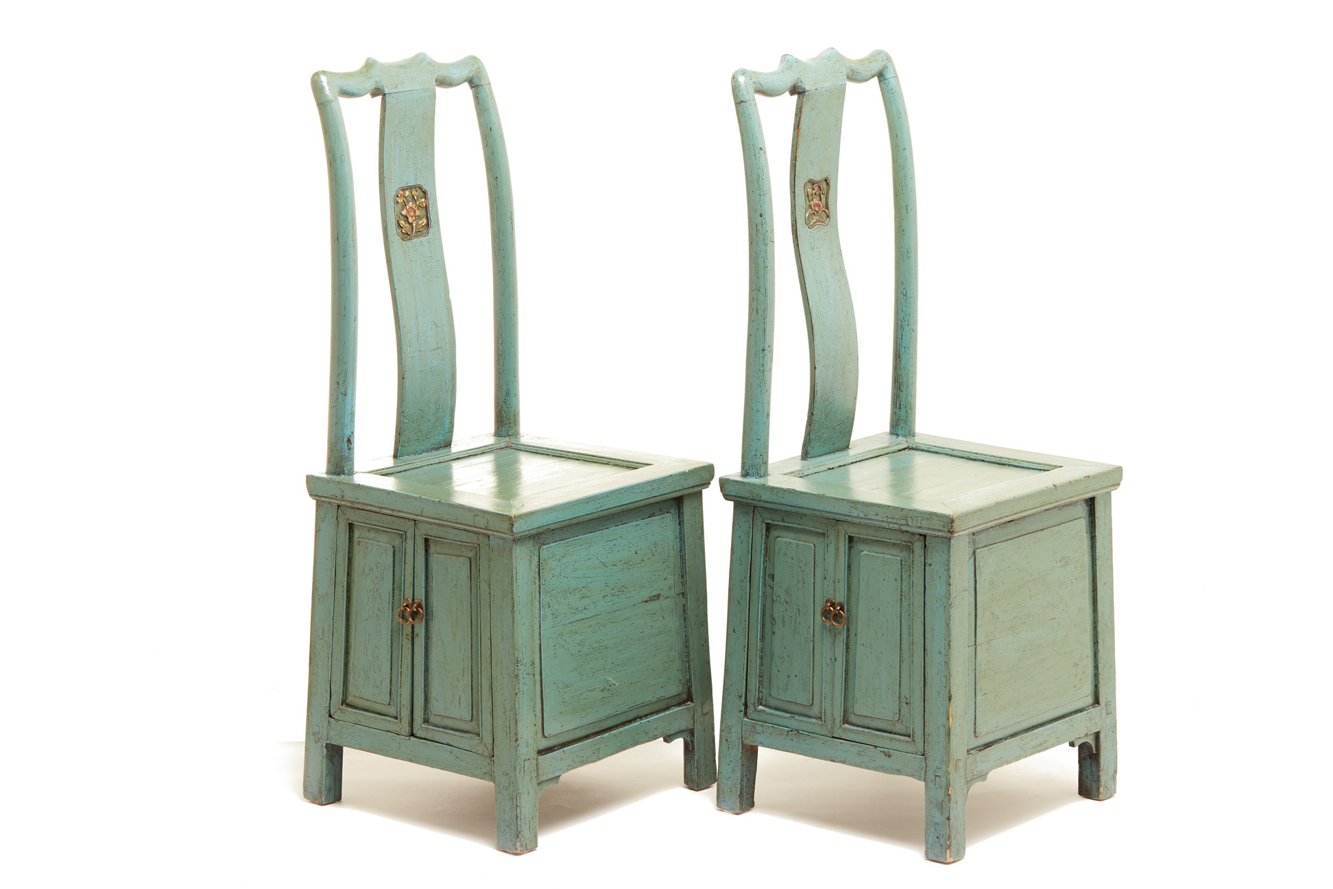 A PAIR OF CHINESE TEAL/GREEN PAINTED CHAIRS