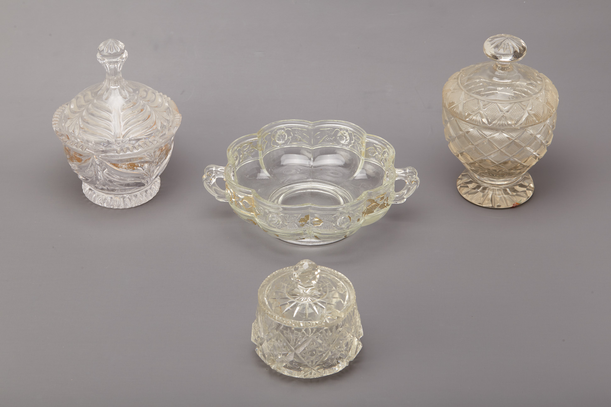 A GROUP OF FOUR CUT AND MOULDED GLASS JARS AND BOWLS