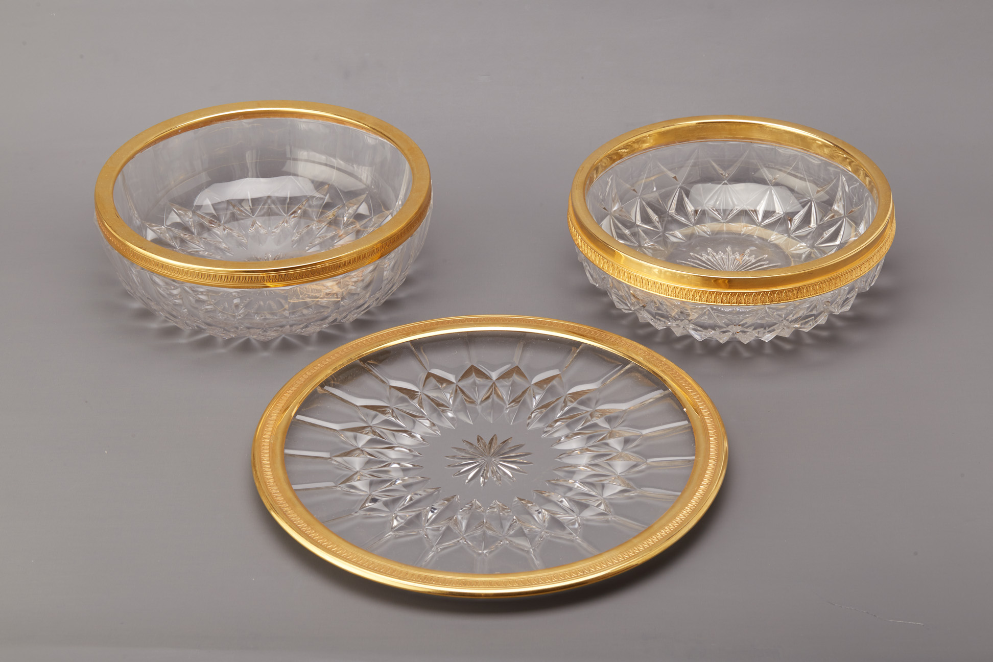 THREE VAL ST LAMBERT GILT METAL MOUNTED GLASS DISHES