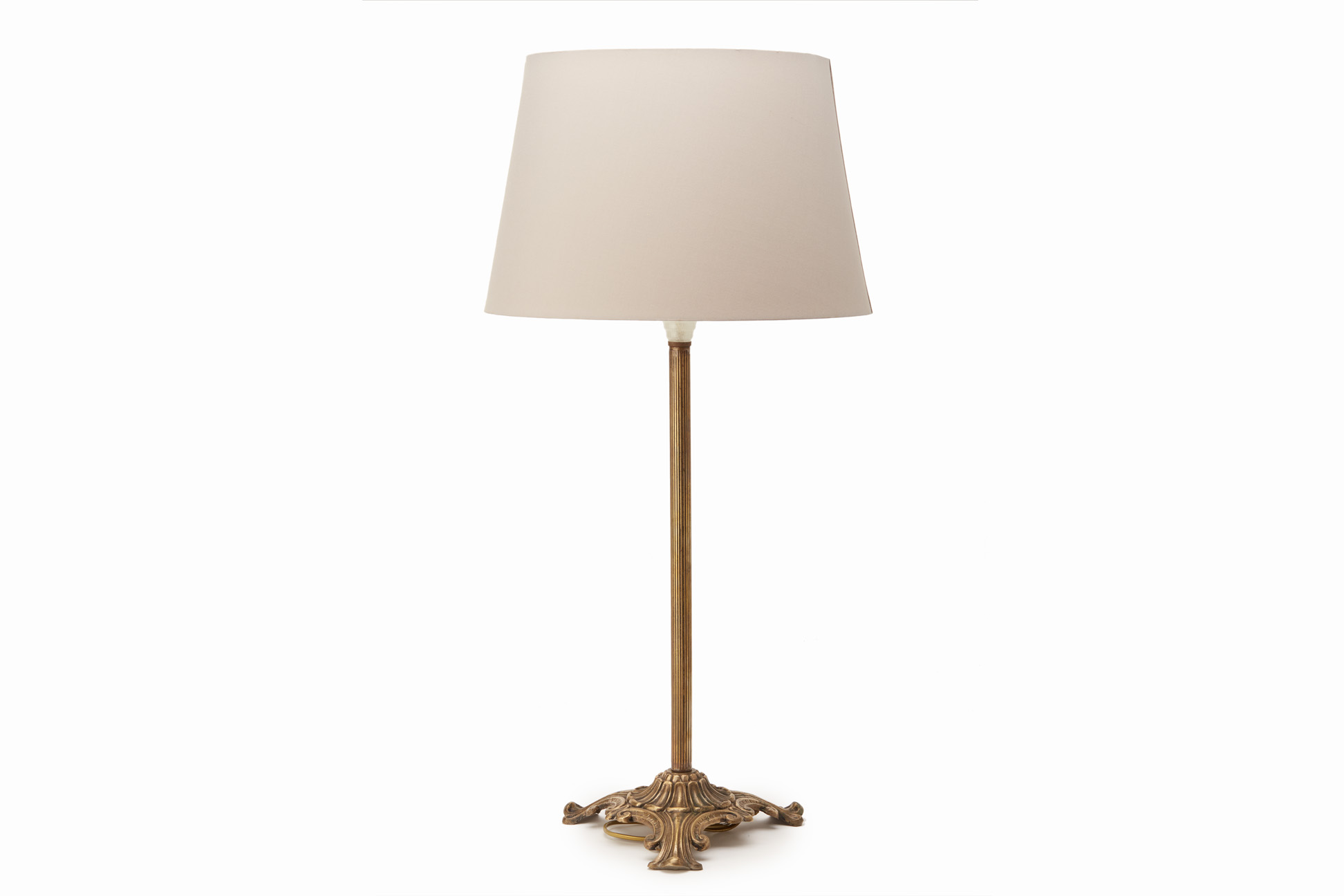 A BRASS TABLE LAMP WITH GREY SHADE