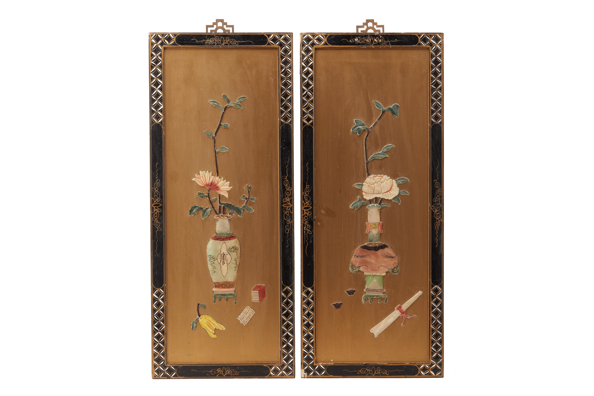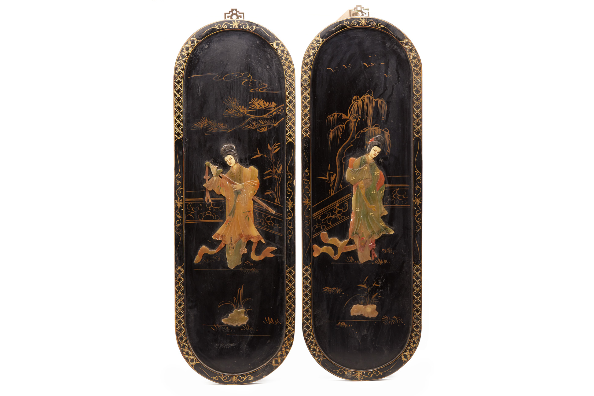 A PAIR OF HARDSTONE INLAID BLACK LACQUER WALL PANELS