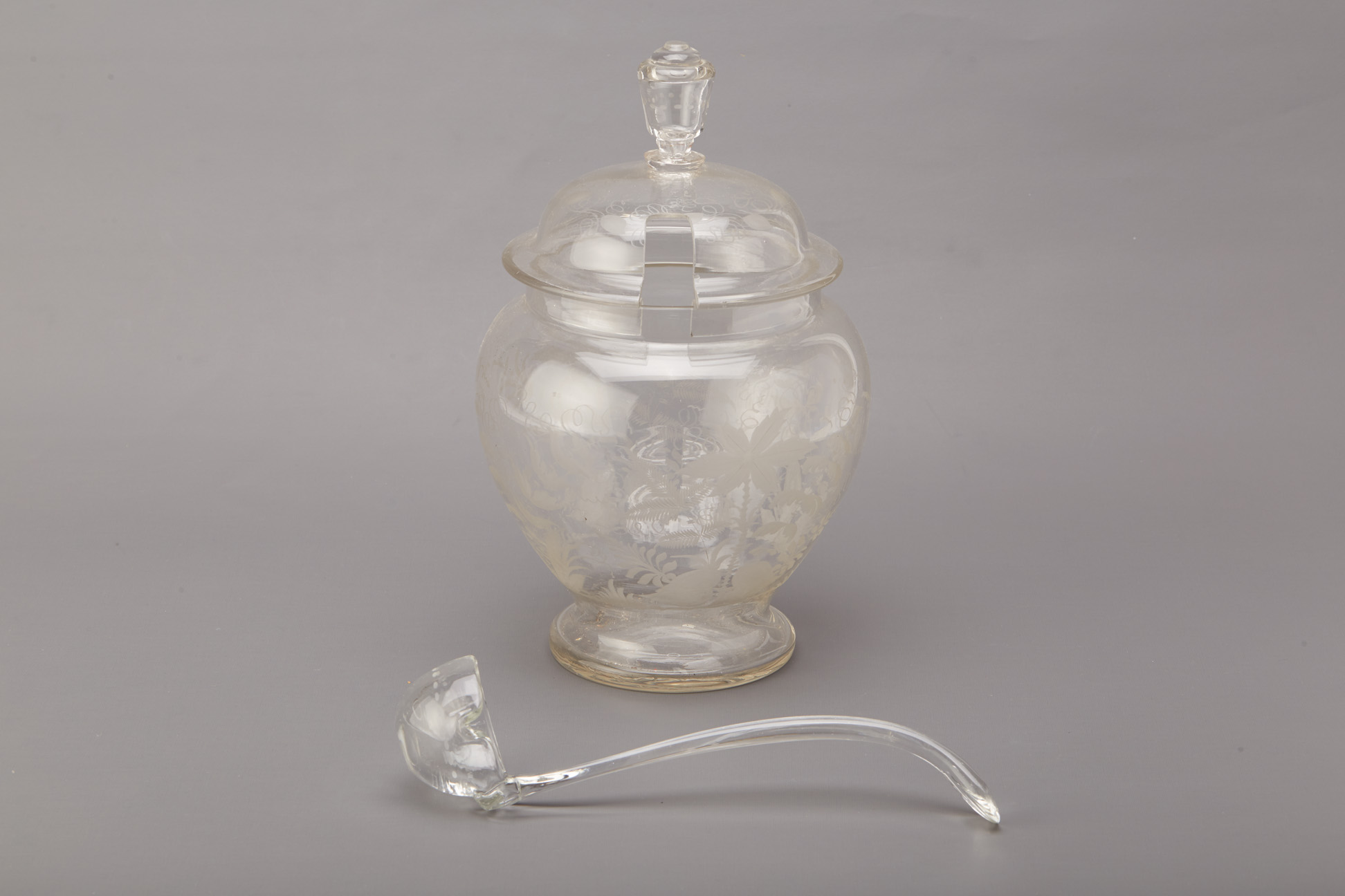 A GLASS PUNCH JAR AND COVER WITH LADLE