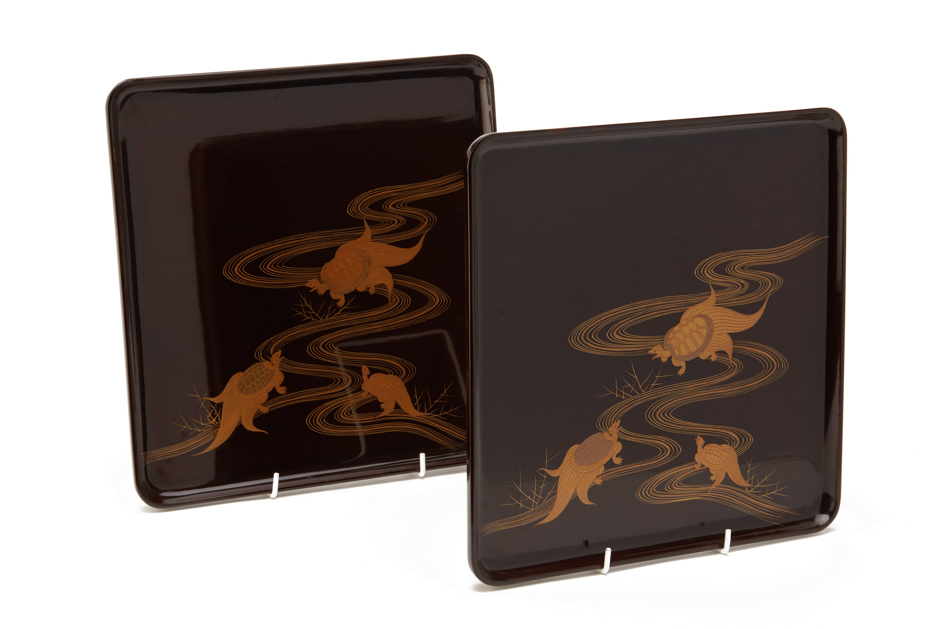 A PAIR OF JAPANESE SQUARE BROWN AND GILT LACQUER TRAYS