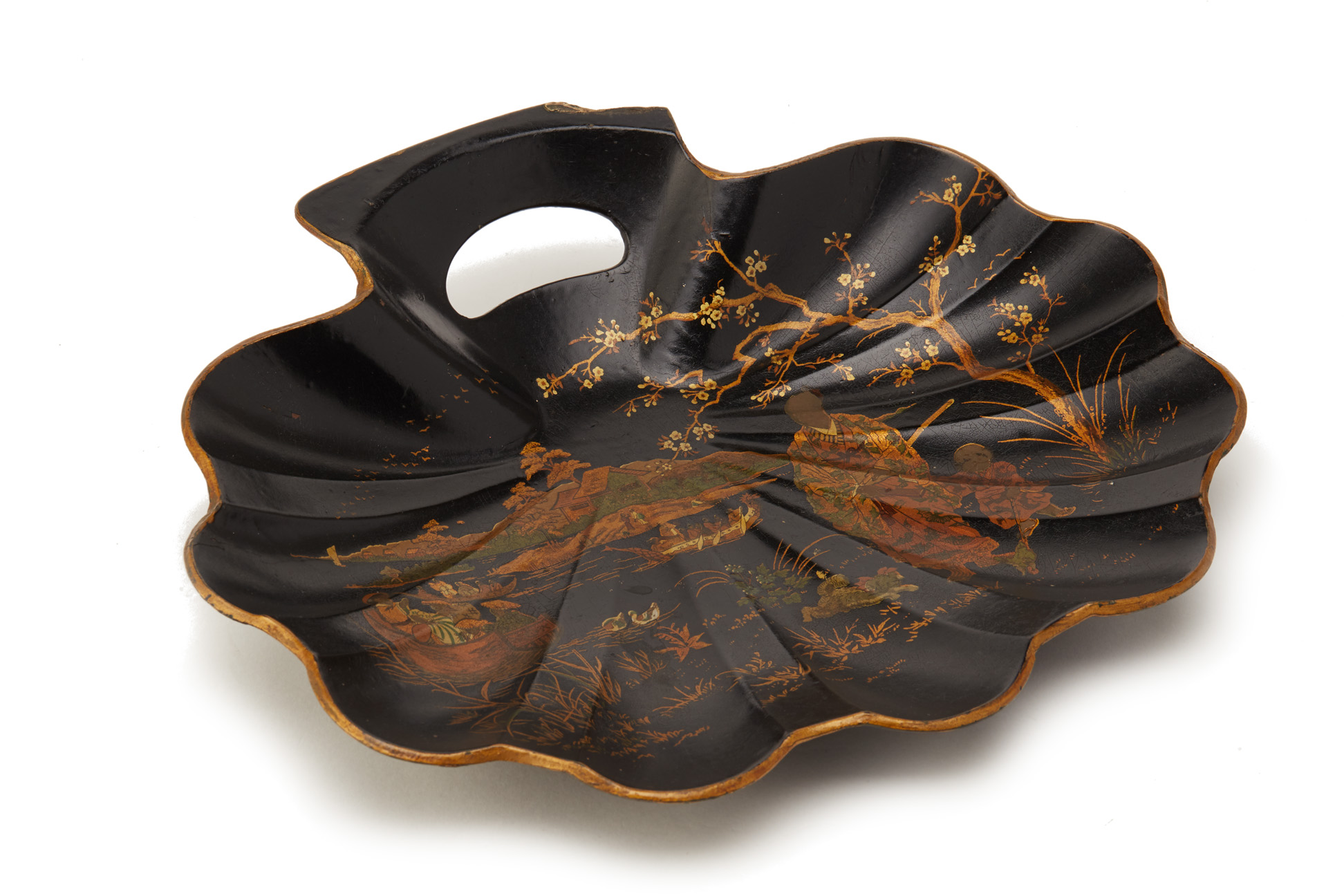 A CHINOISERIE PAPIER MACHE SHELL SHAPED DISH / CRUMB TRAY