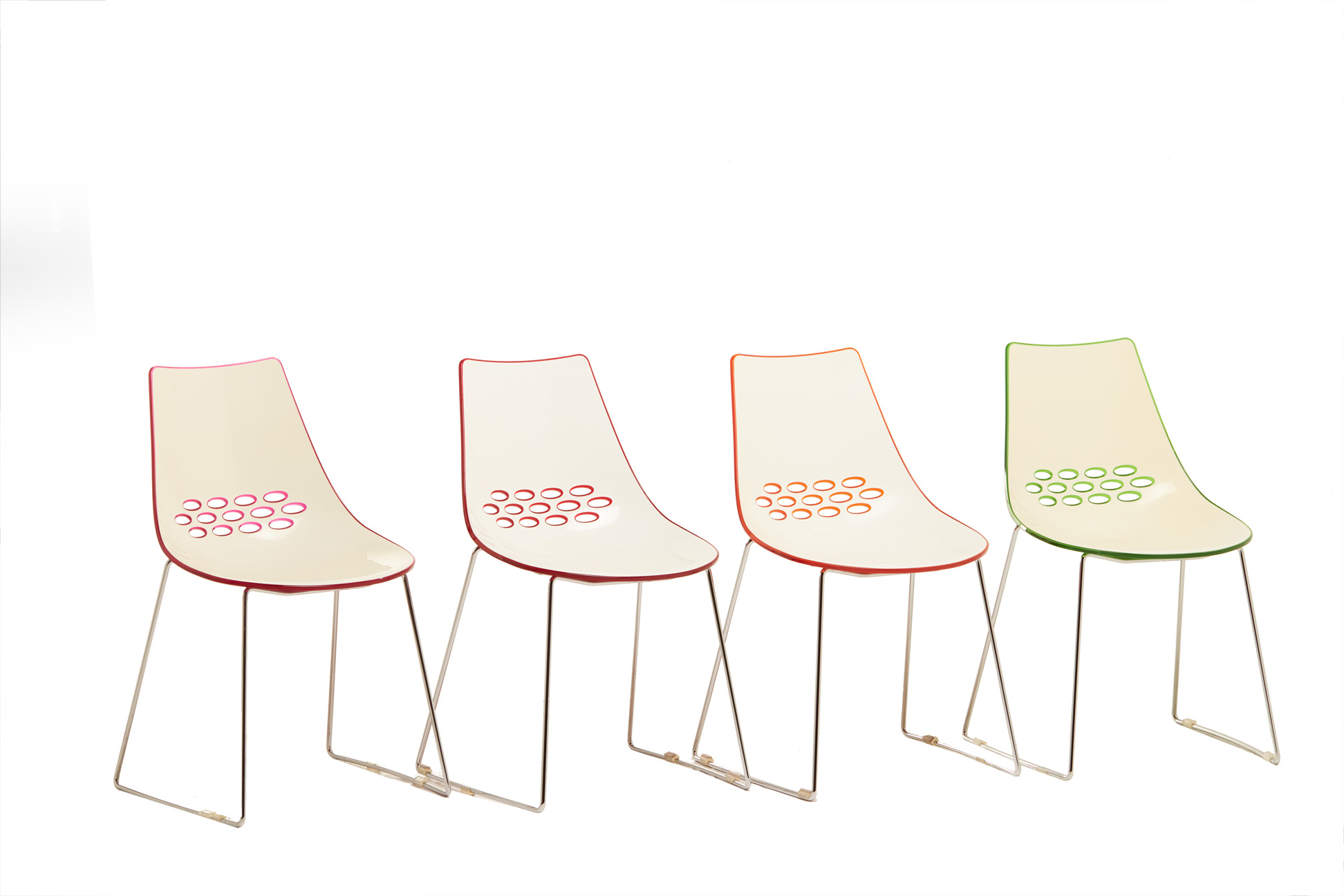 A HARLEQUIN SET OF FOUR COLOURED ITALIAN CHAIRS