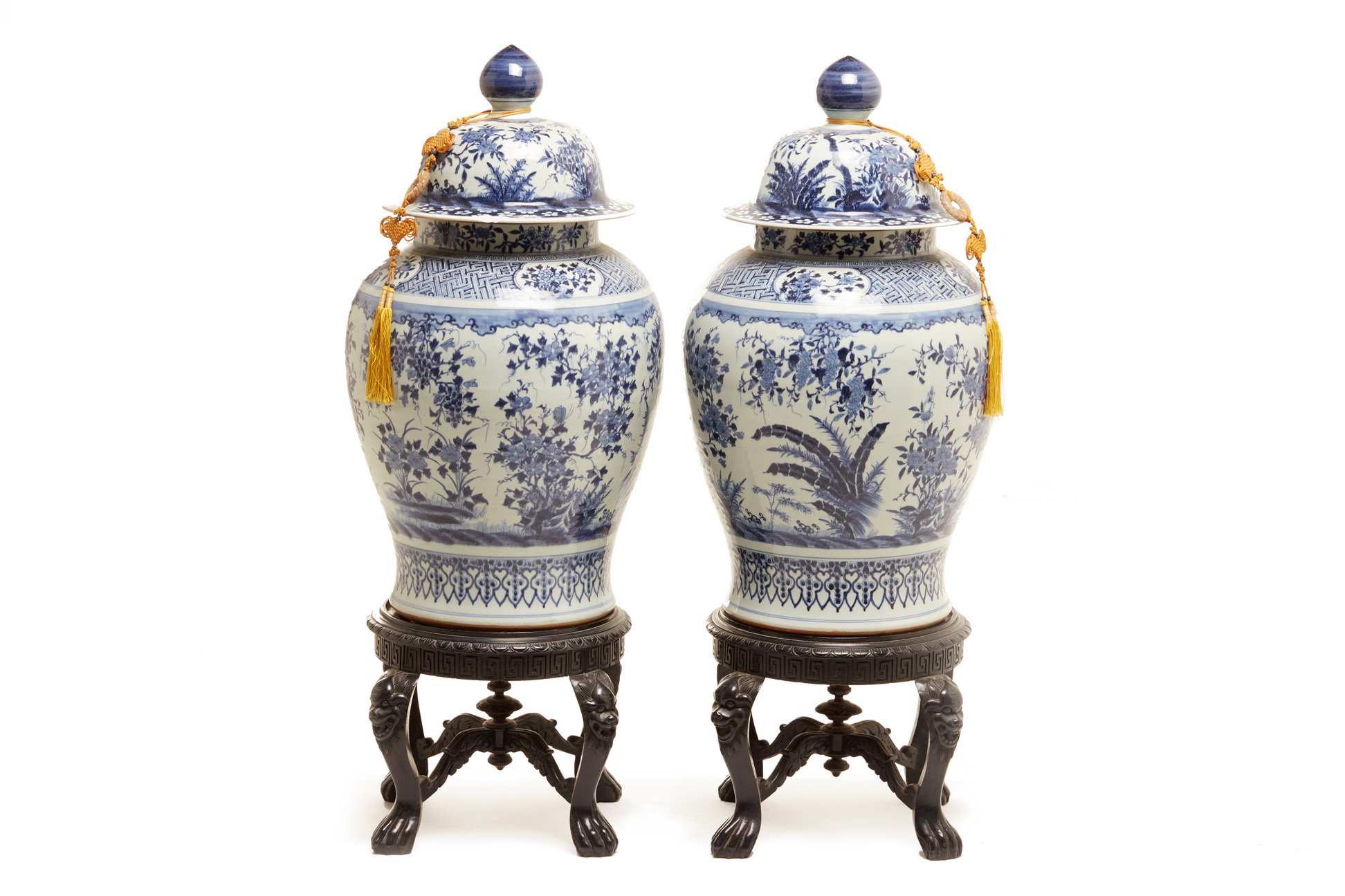 A PAIR OF LARGE BLUE & WHITE JARS AND COVERS ON STAND