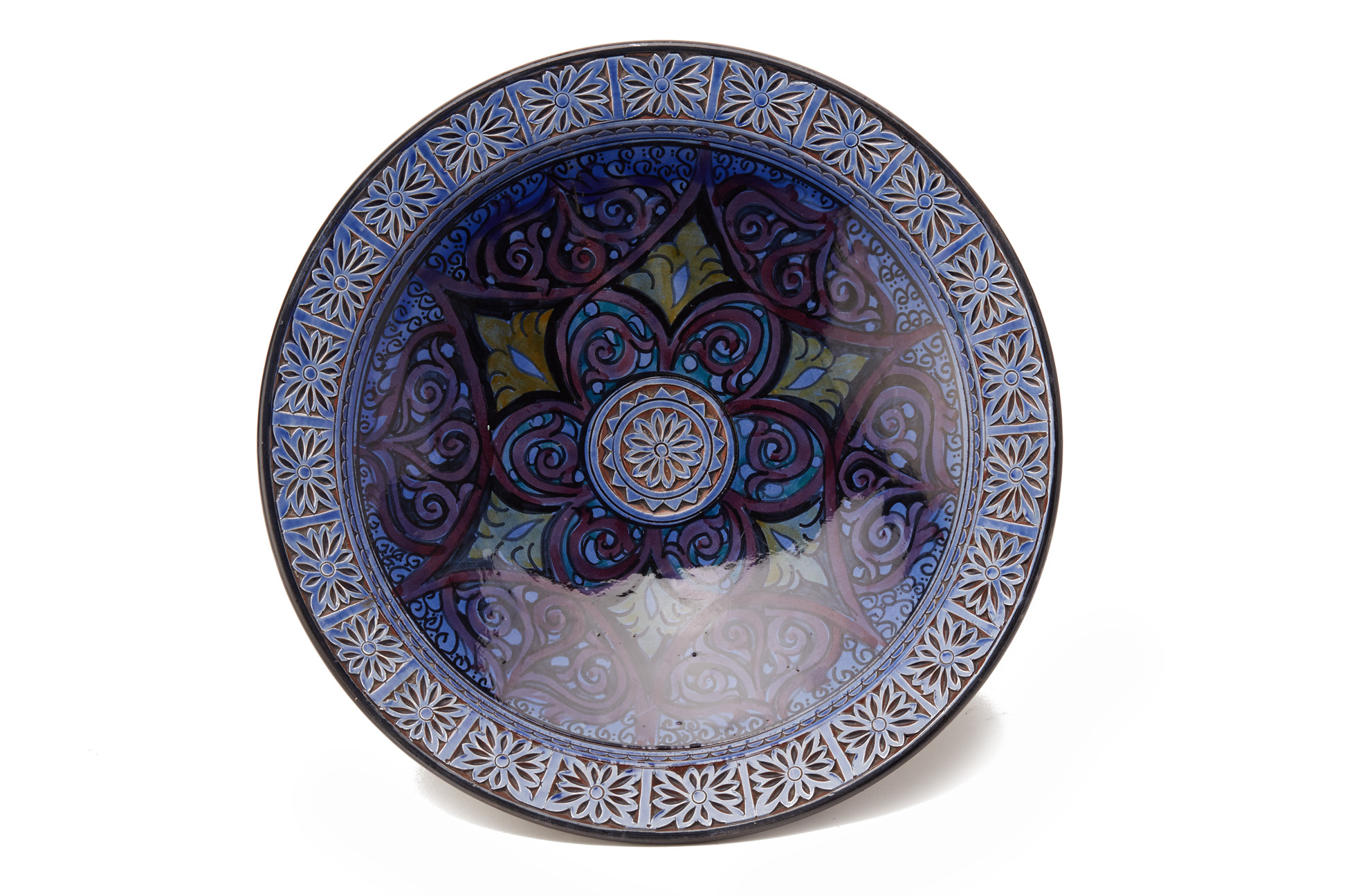 A MOROCCAN BLUE GLAZED POTTERY CHARGER