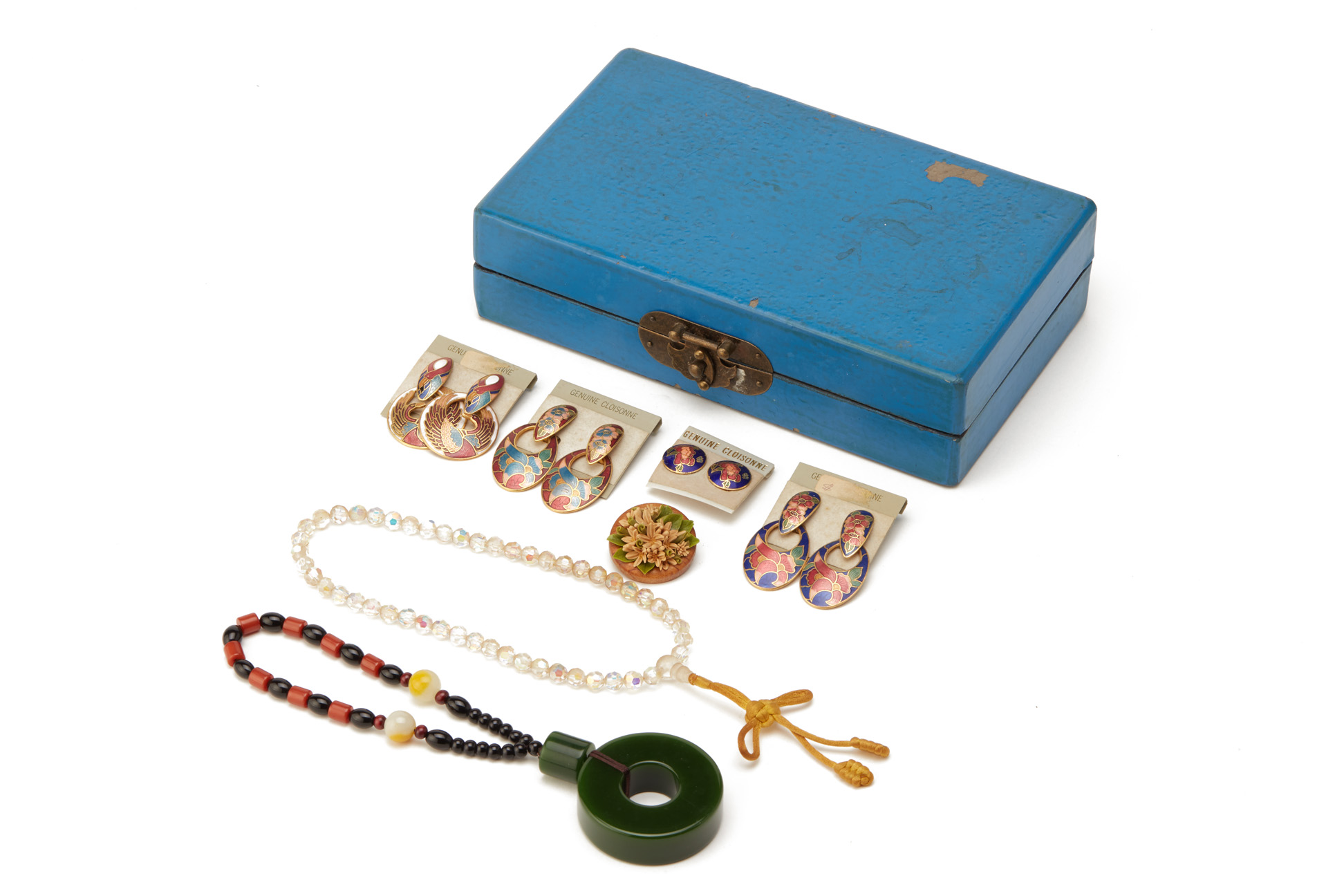 RTO*A BLUE WOOD BOX CONTAINING A GROUP OF COSTUME JEWELLERY