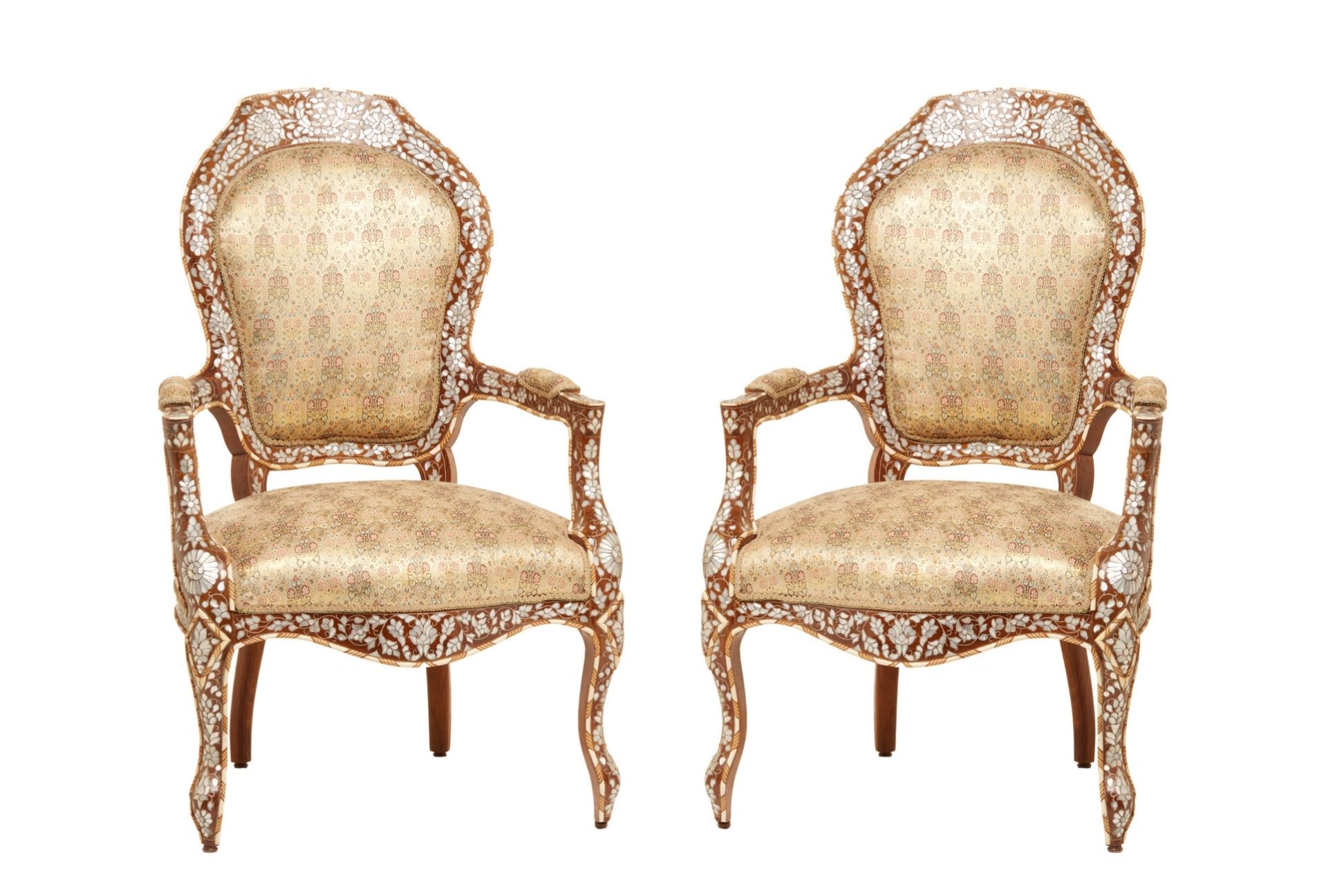 A PAIR OF SYRIAN MOTHER OF PEARL AND BONE INLAID FAUTEUILS