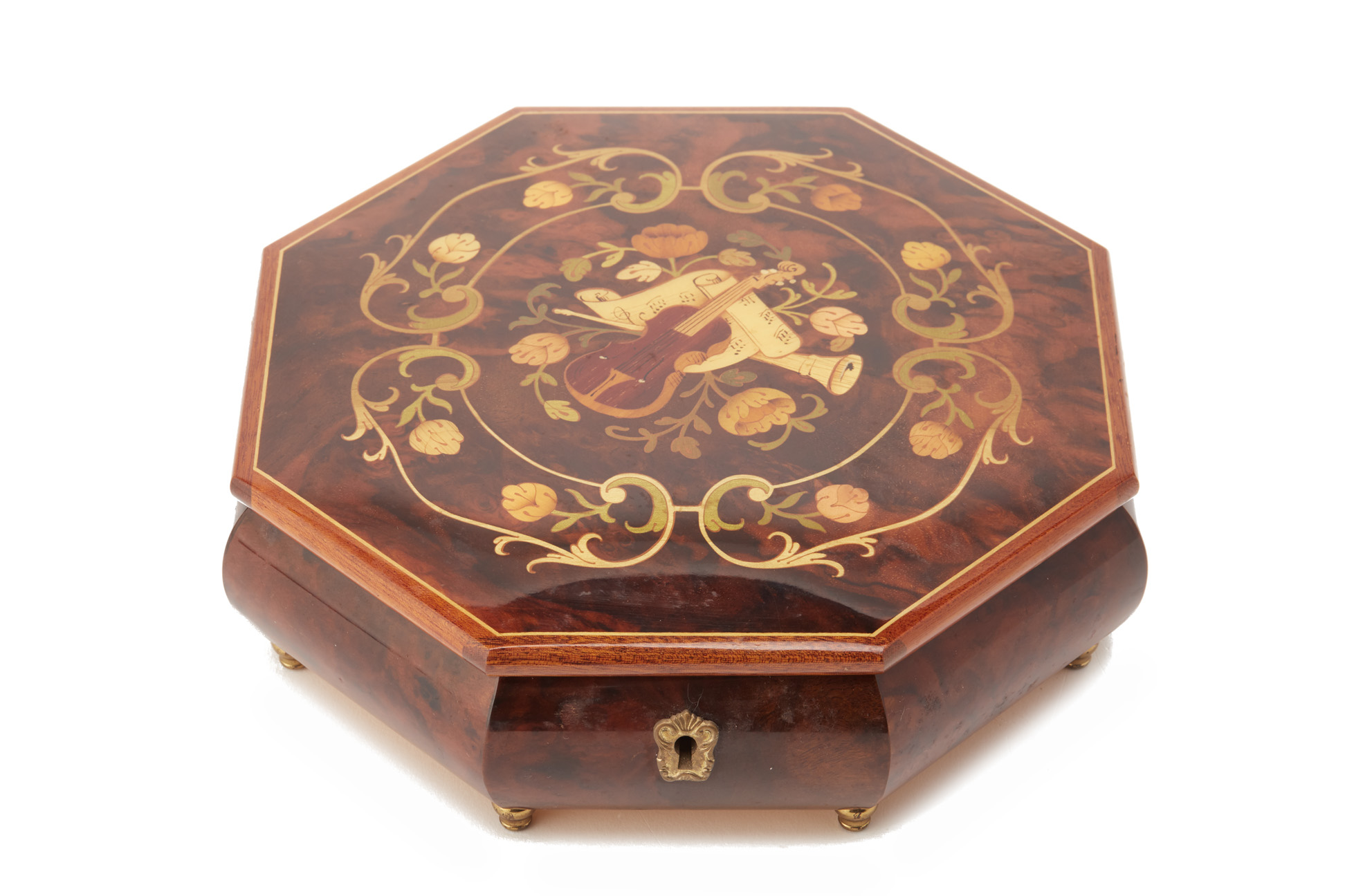 A SORRENTO HEXAGONAL MARQUETRY MUSICAL BOX