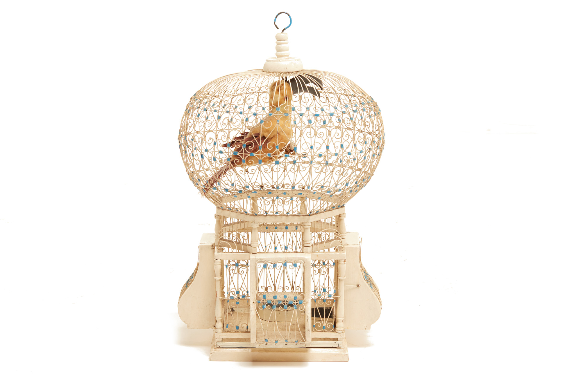 A DECORATIVE WHITE PAINTED BIRD CAGE