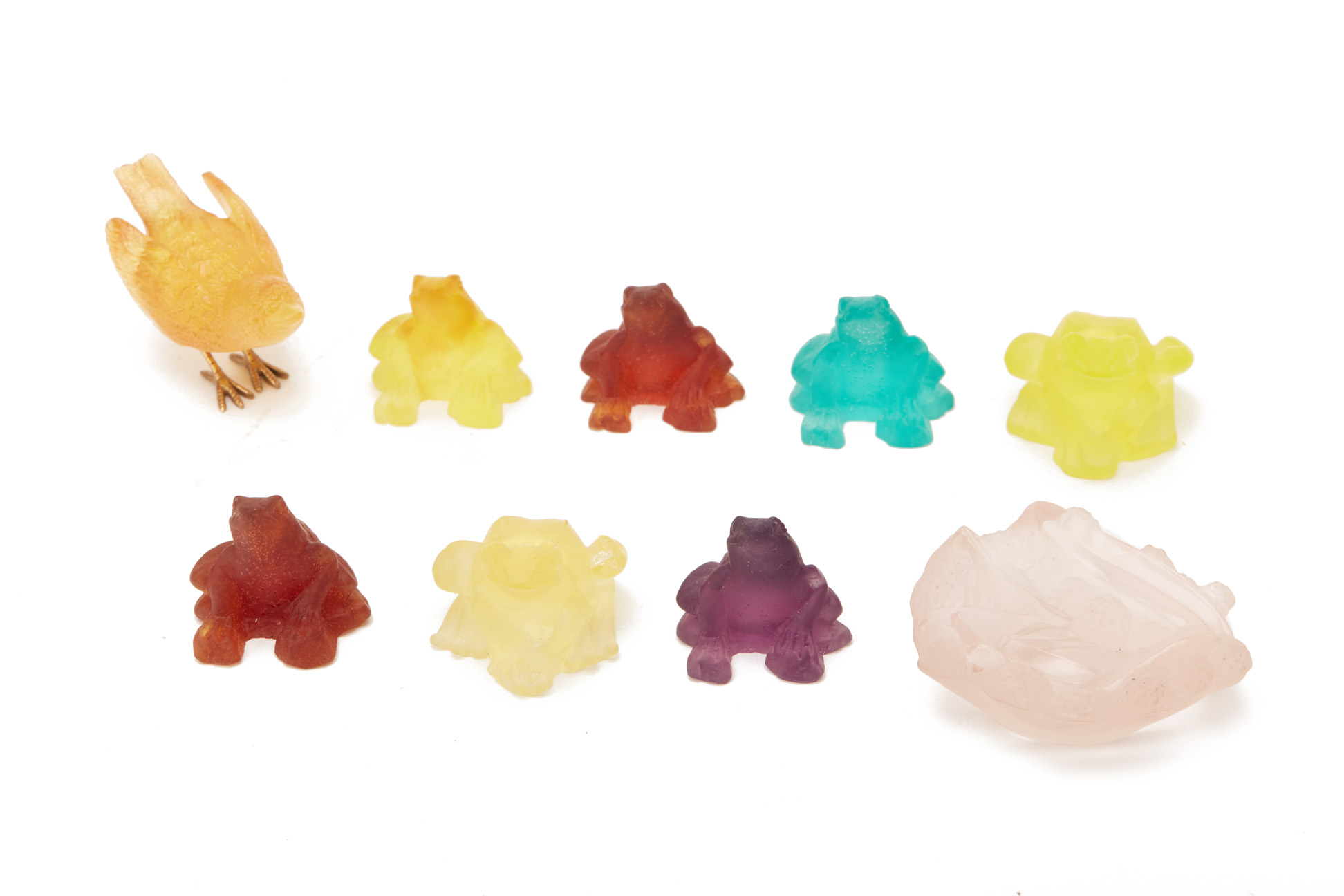 A GROUP OF DAUM PATE DE VERRE GLASS & A GLASS BIRD