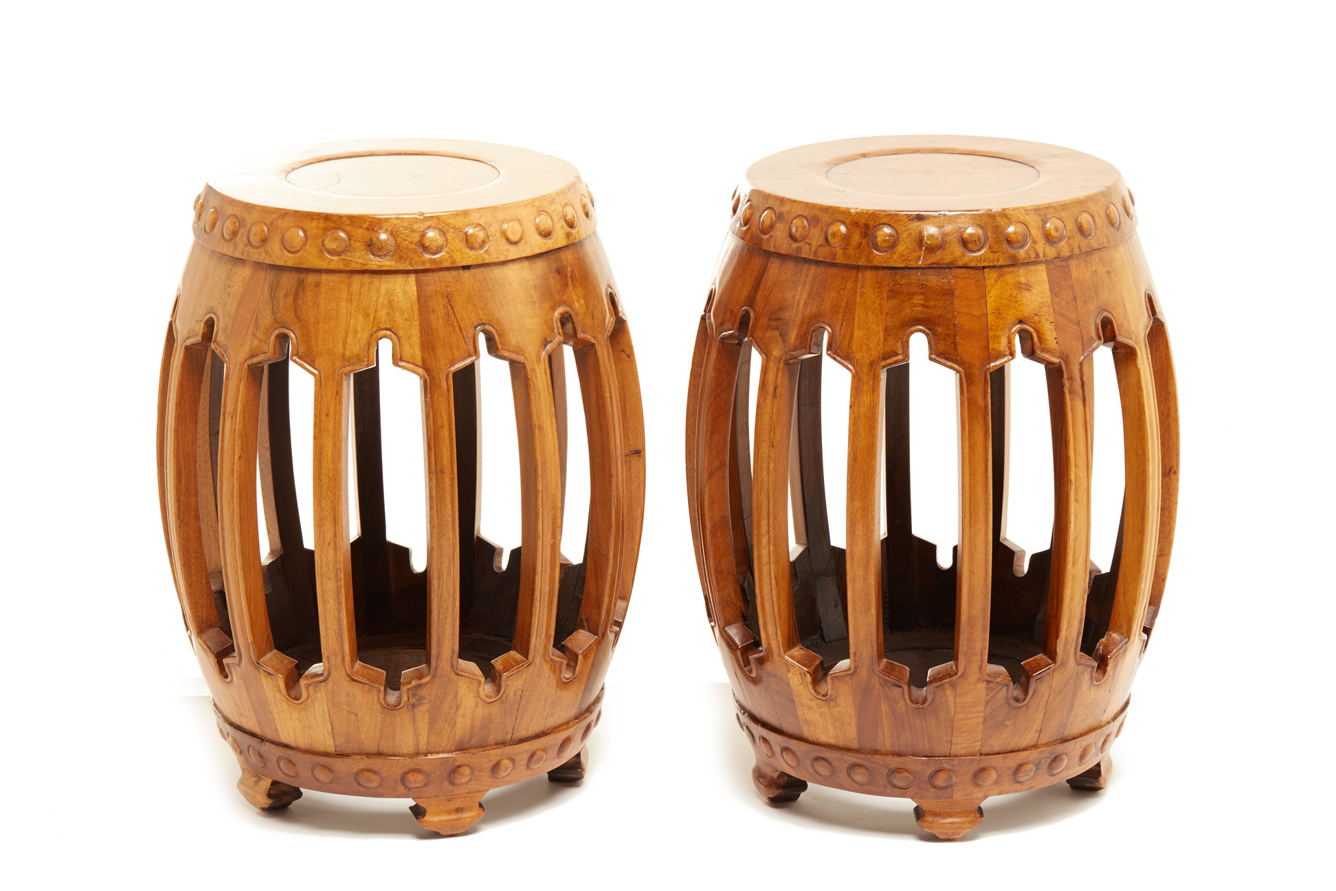 A PAIR OF WOODEN BARREL FORM DRUM STOOLS