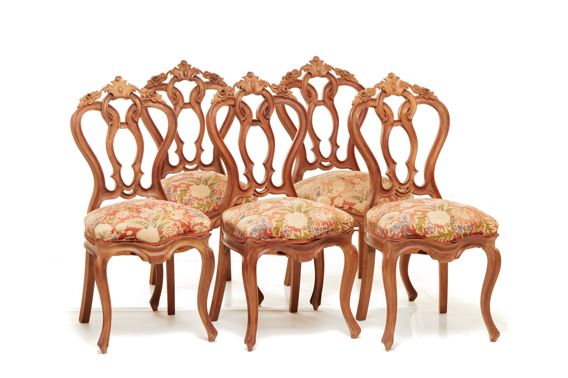 A SET OF FIVE ANTIQUE CARVED DINING CHAIRS