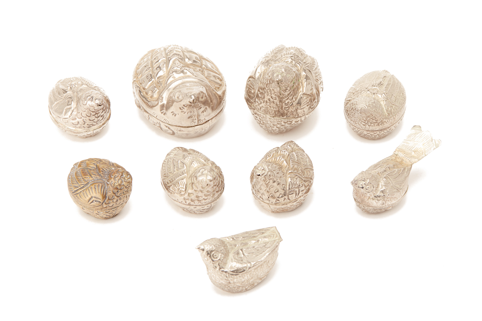 A GROUP OF 9 METALWARE NOVELTY BIRD BOXES
