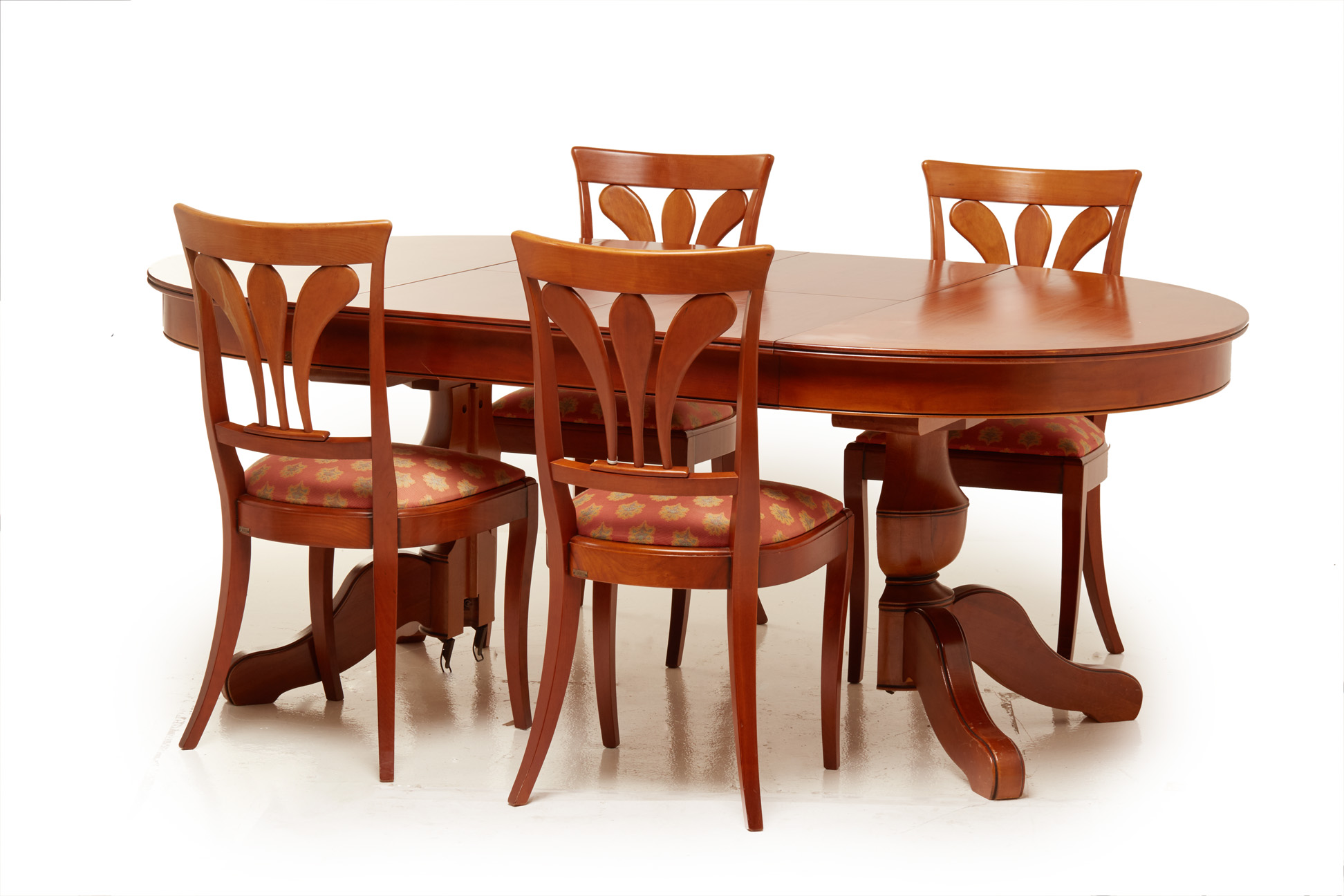 A GRANGE CHERRY WOOD EXTENDING DINING TABLE AND FOUR CHAIRS