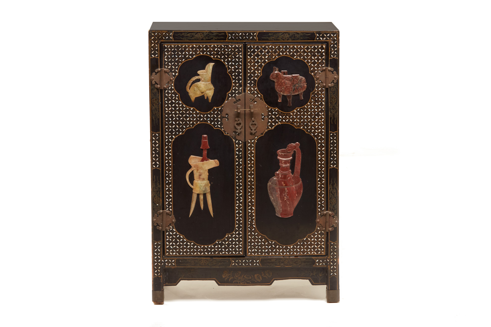 A BLACK LACQUER AND HARDSTONE INLAID SIDE CABINET