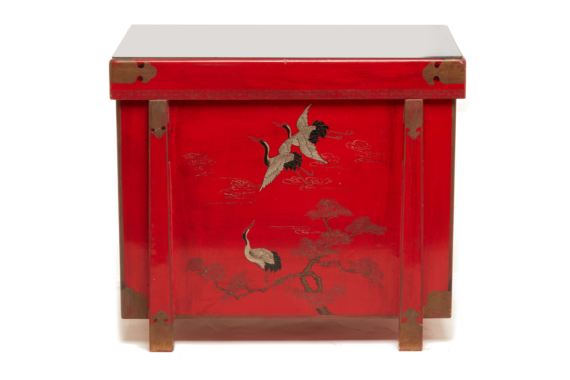 A JAPANESE RED LACQUER CHEST DECORATED WITH CRANES