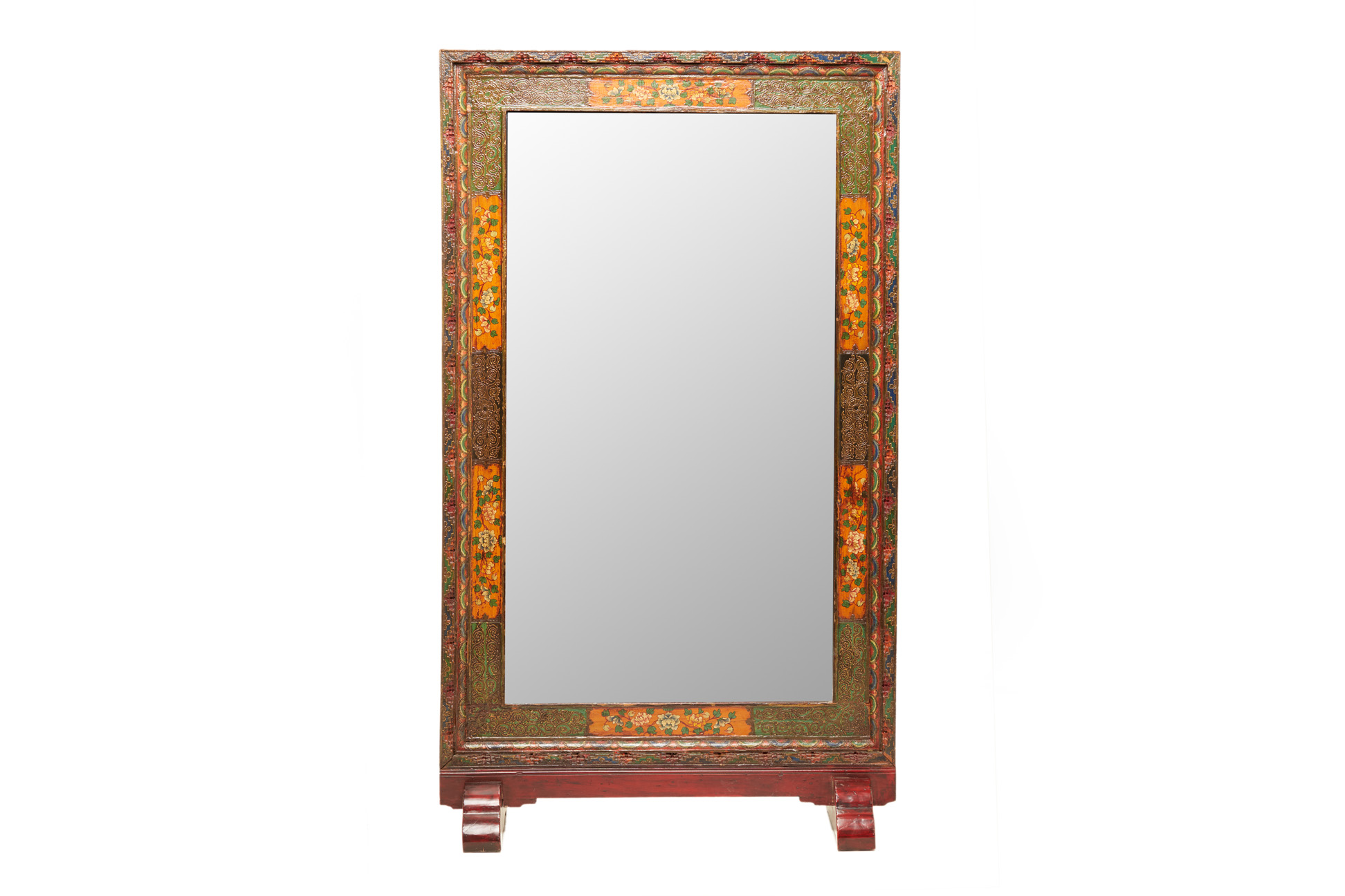 A LARGE CARVED & PAINTED TIBETAN MIRROR ON STAND