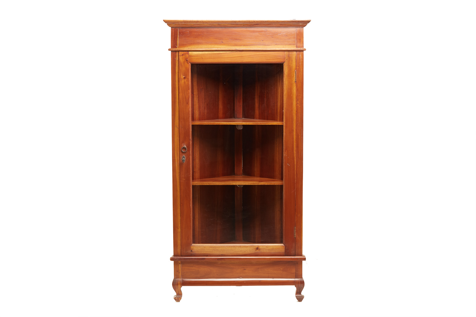 A CORNER WOODEN DISPLAY CABINET