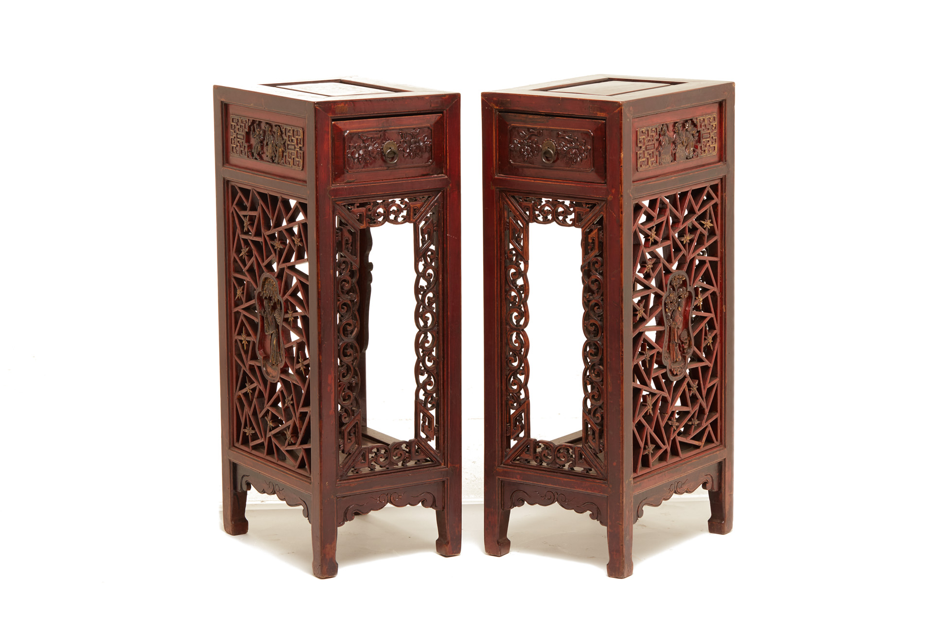 A PAIR OF TALL CHINESE CARVED SIDE TABLES