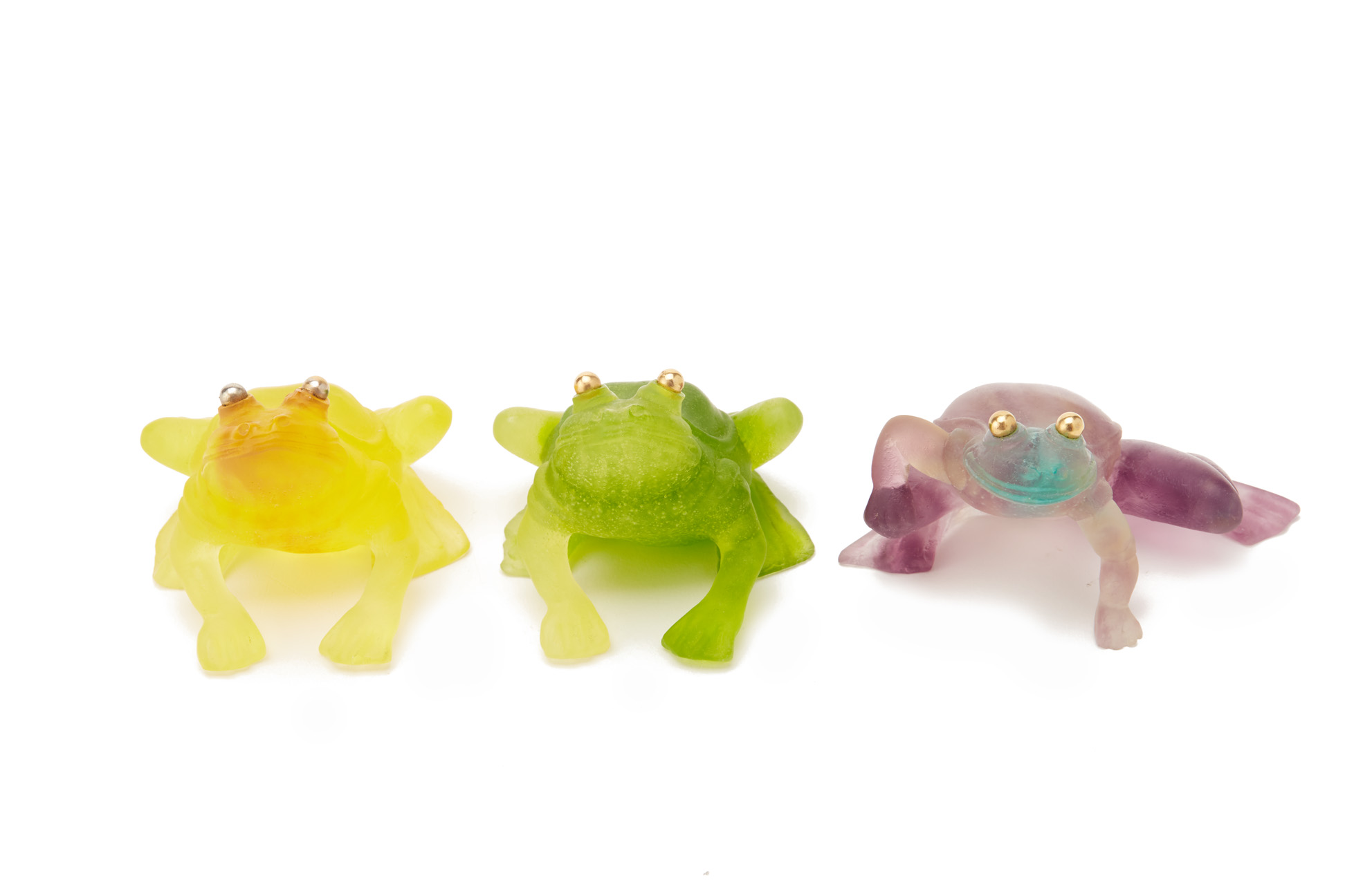THREE DAUM PATE DE VERRE GLASS MODELS OF FROGS