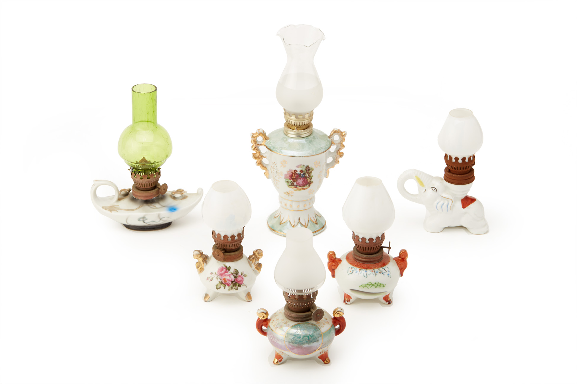A GROUP OF SIX SMALL VINTAGE OIL LAMPS