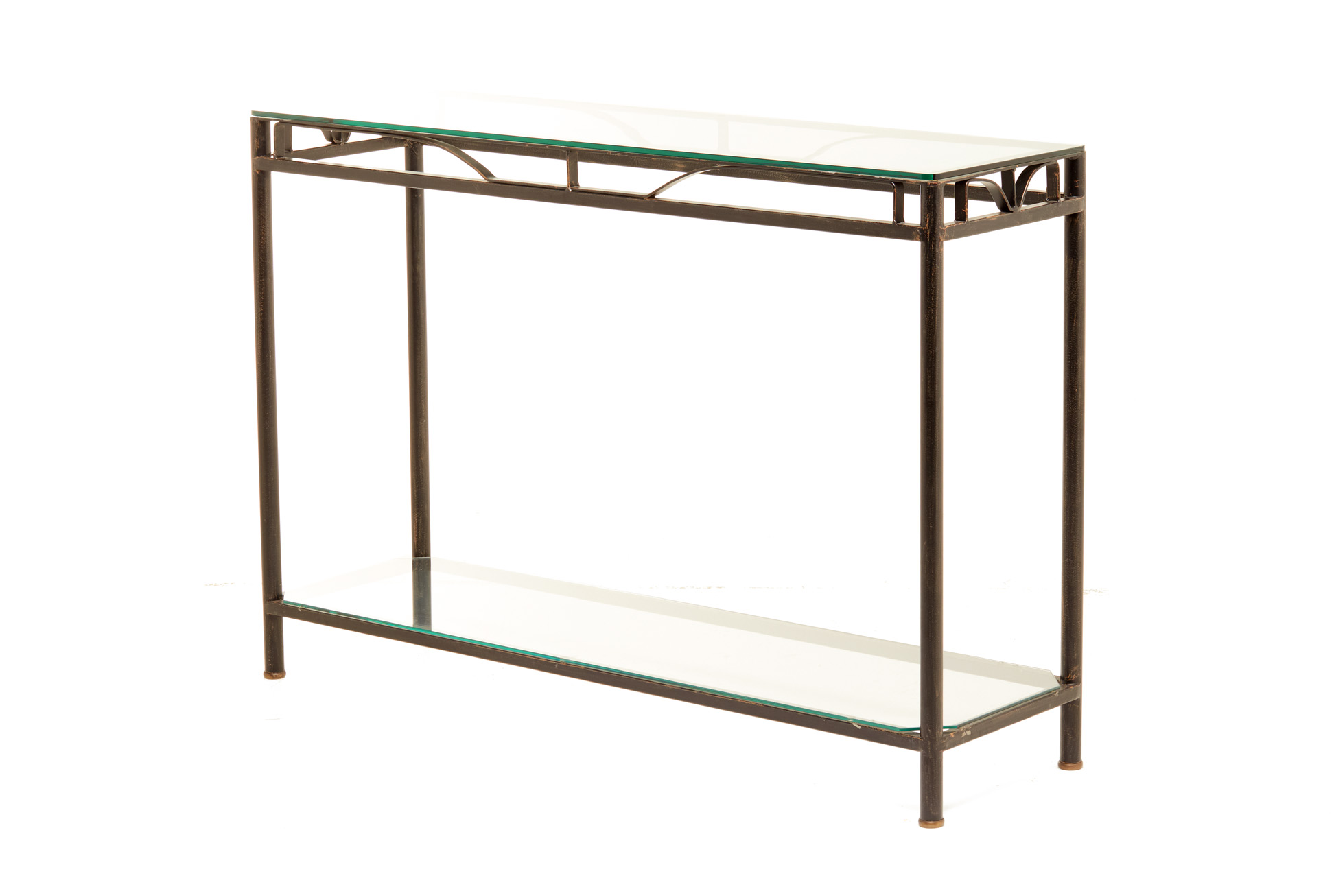 A GLASS TOPPED AND WROUGHT IRON CONSOLE TABLE