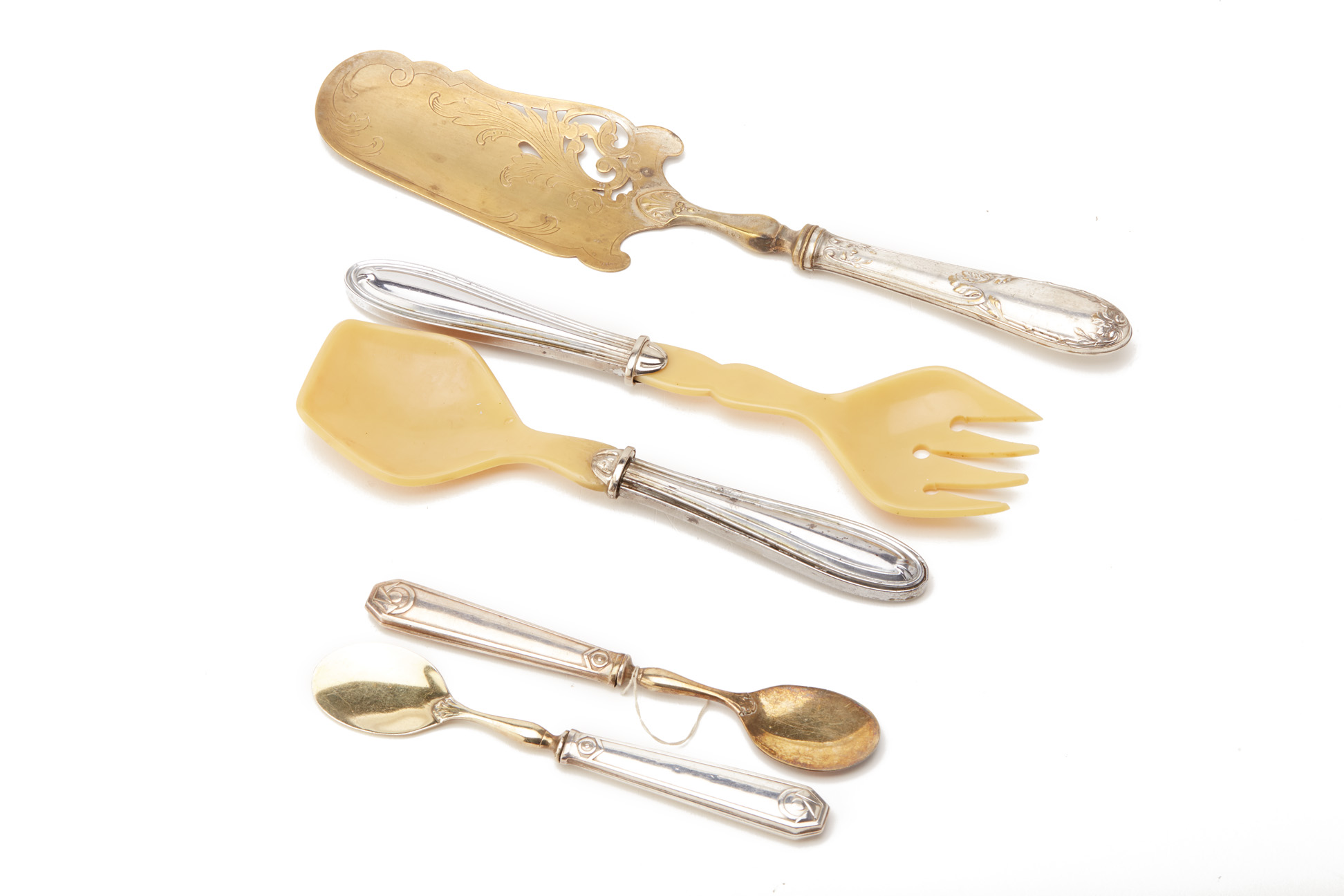 A GROUP OF SILVER PLATED SERVING UTENSILS