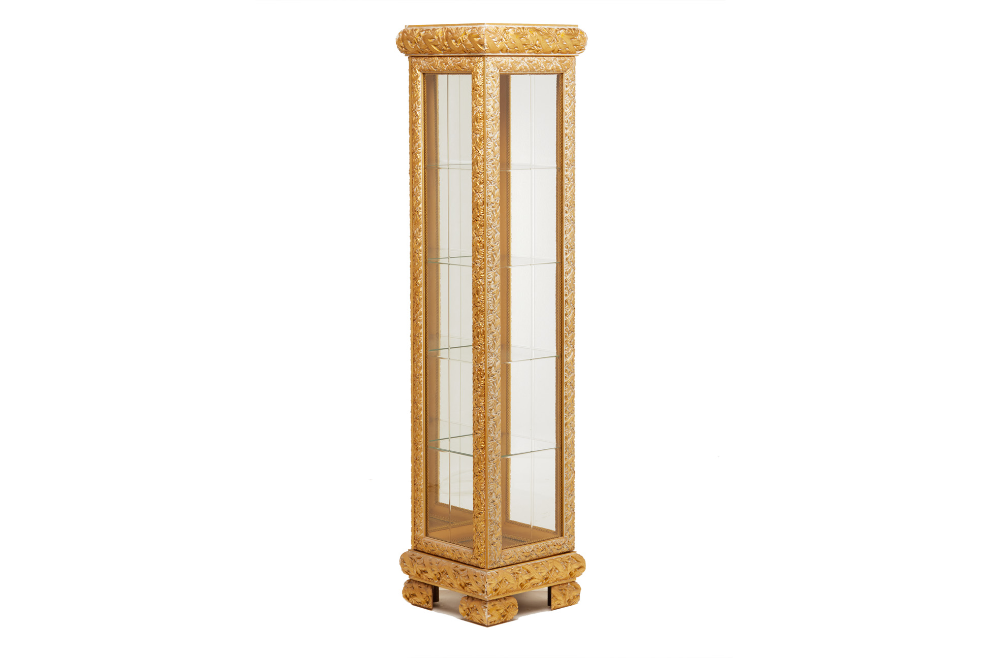 A TALL SLENDER GILT DISPLAY CABINET
