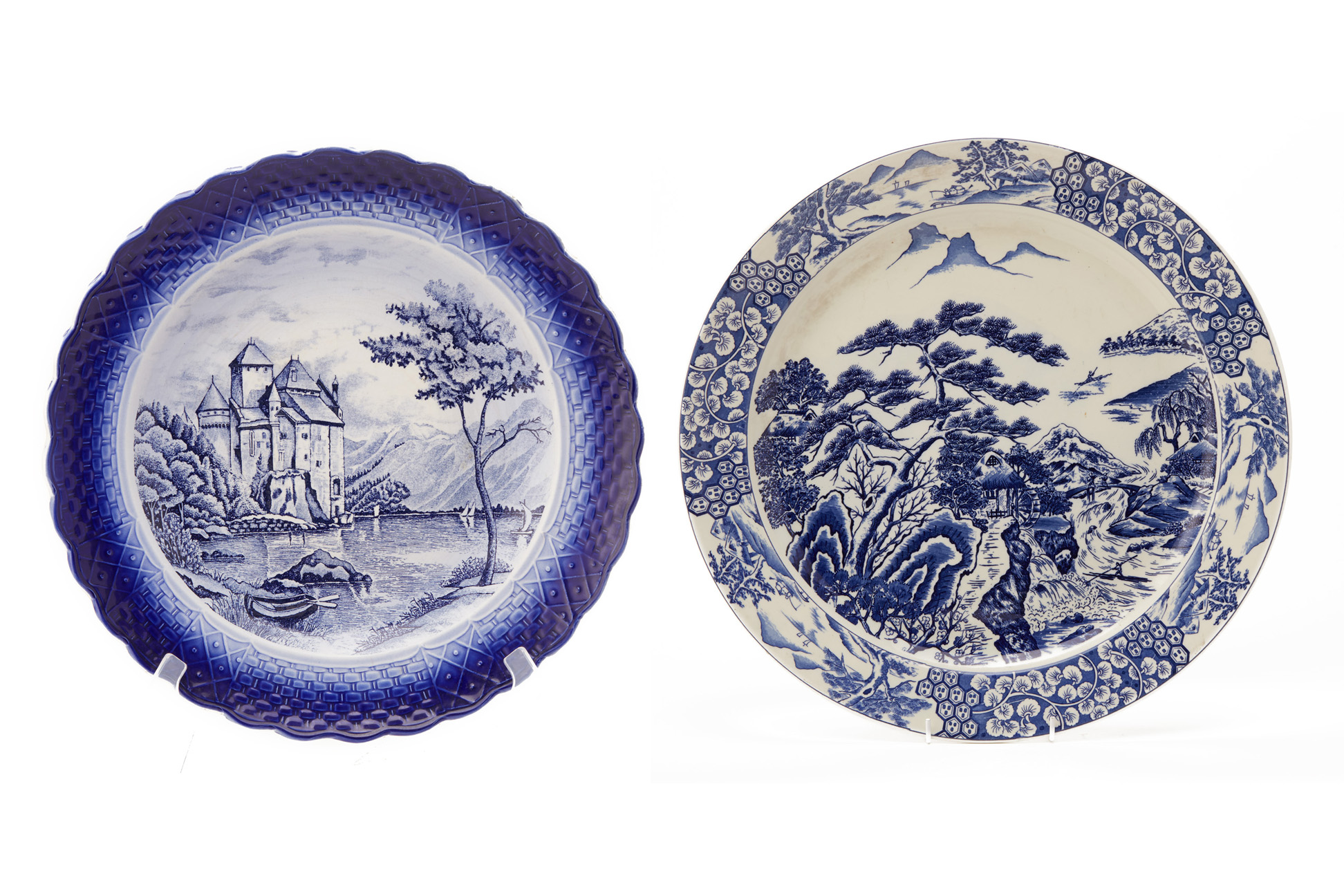 TWO JAPANESE BLUE & WHITE LANDSCAPE CHARGERS