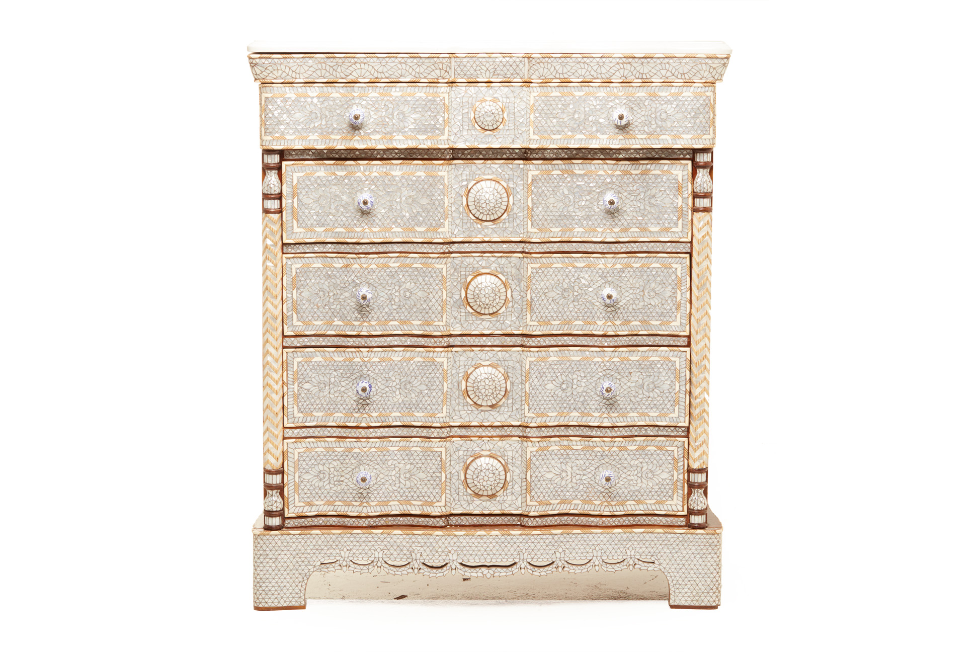 A SYRIAN MOTHER OF PEARL AND BONE INLAID CHEST OF DRAWERS