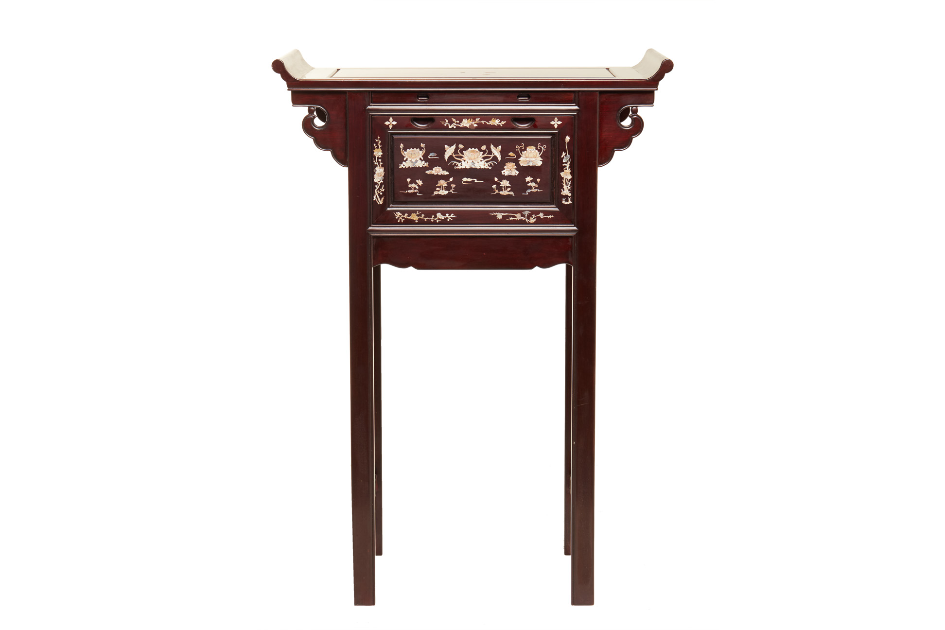 A MOTHER OF PEARL INLAID ALTAR FORM HARDWOOD SIDE TABLE