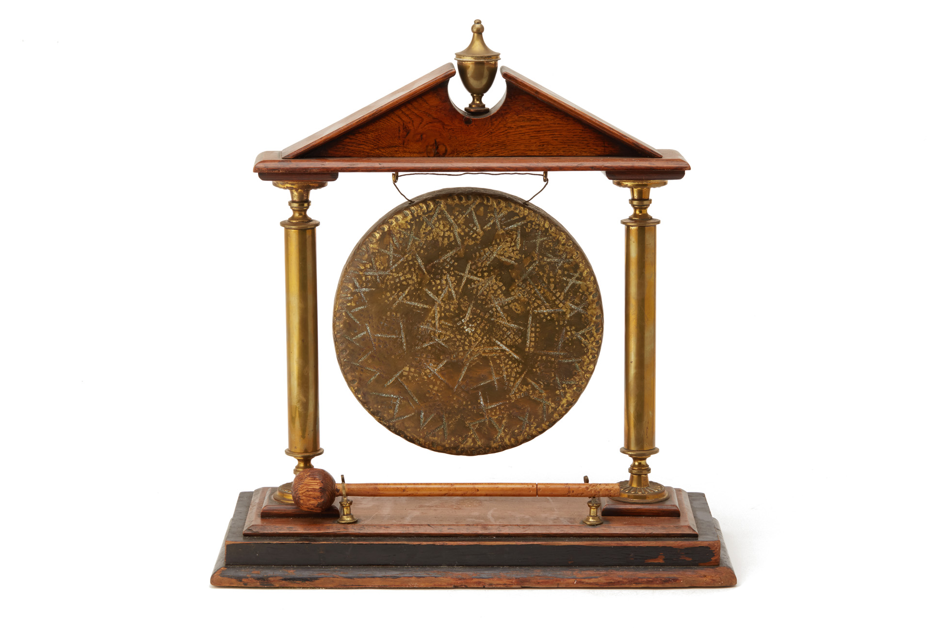 A BRASS AND OAK ARCHITECTURAL TABLE GONG